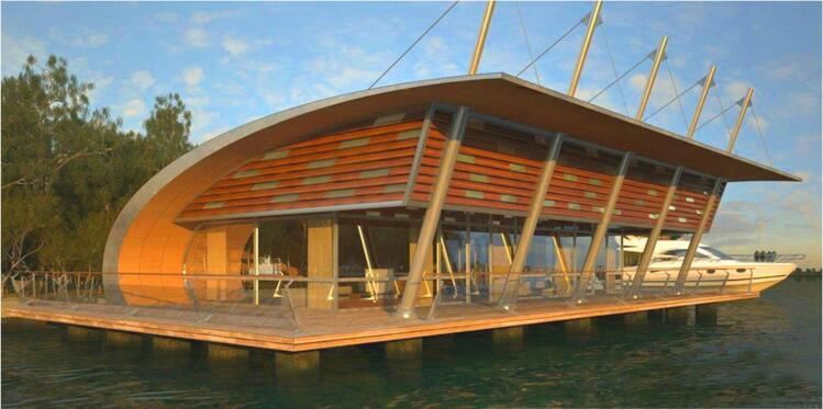 水上建筑設計適宜采用通透的建筑外殼,輕盈的建筑造型,因此該水上運動中心建筑設計采用現(xiàn)代風格,采用鋼架結構的形式,建筑材料專用采用鋼構架、防腐木和玻璃,屋頂設計采用流線型,挑出屋頂?shù)闹雍弯摻z拉線與現(xiàn)狀水上高爾夫的張拉膜結構形成統(tǒng)一風格。