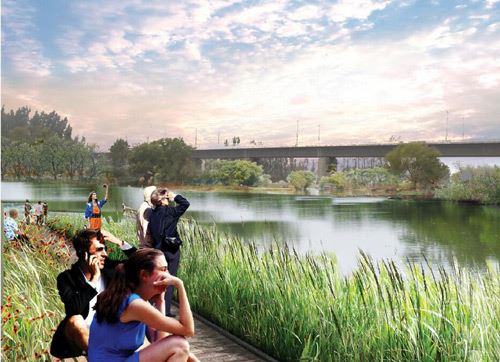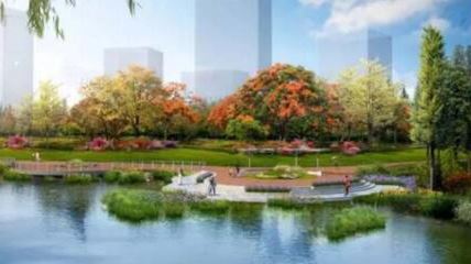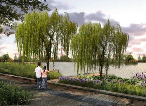 依托現(xiàn)狀地形地貌,打造親水平臺,結合用地規(guī)劃打造條狀小游園。