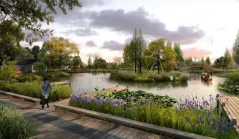 以荷花為主題,堤岸打造木棧道,河岸搭配蘆葦?shù)戎参铮浞职l(fā)揮綠地效益。